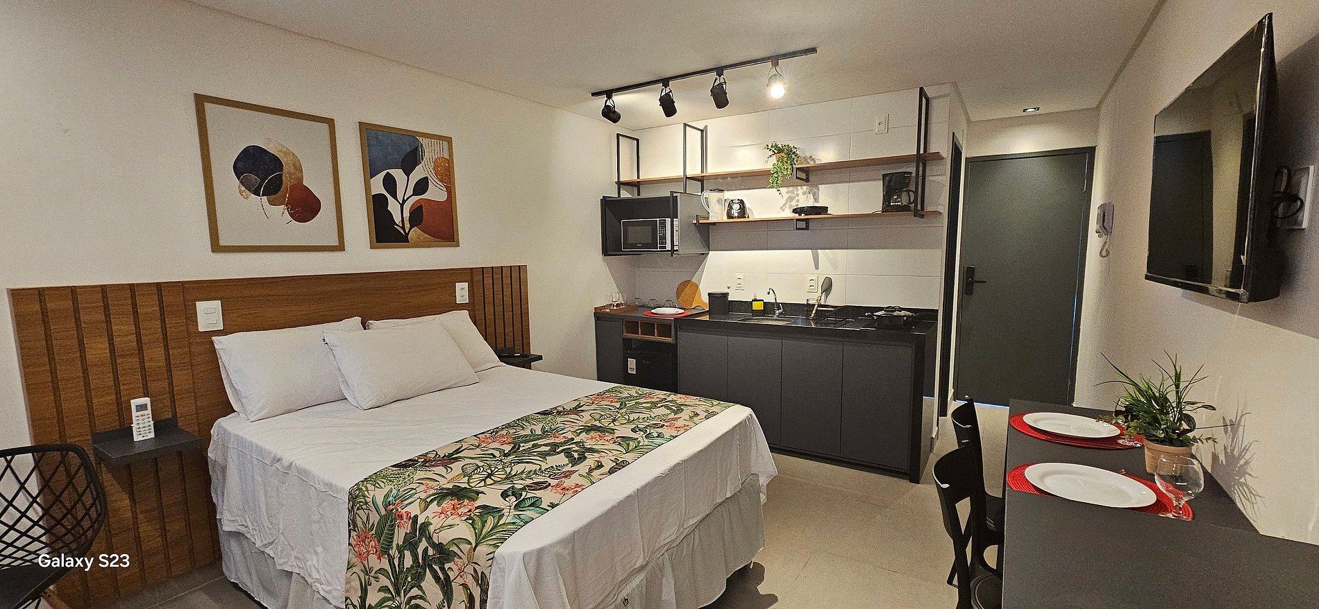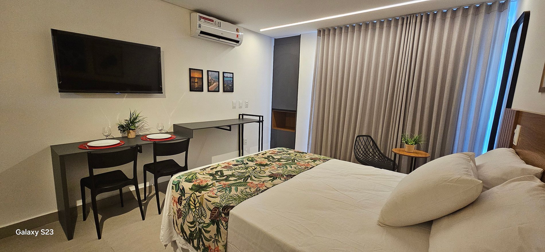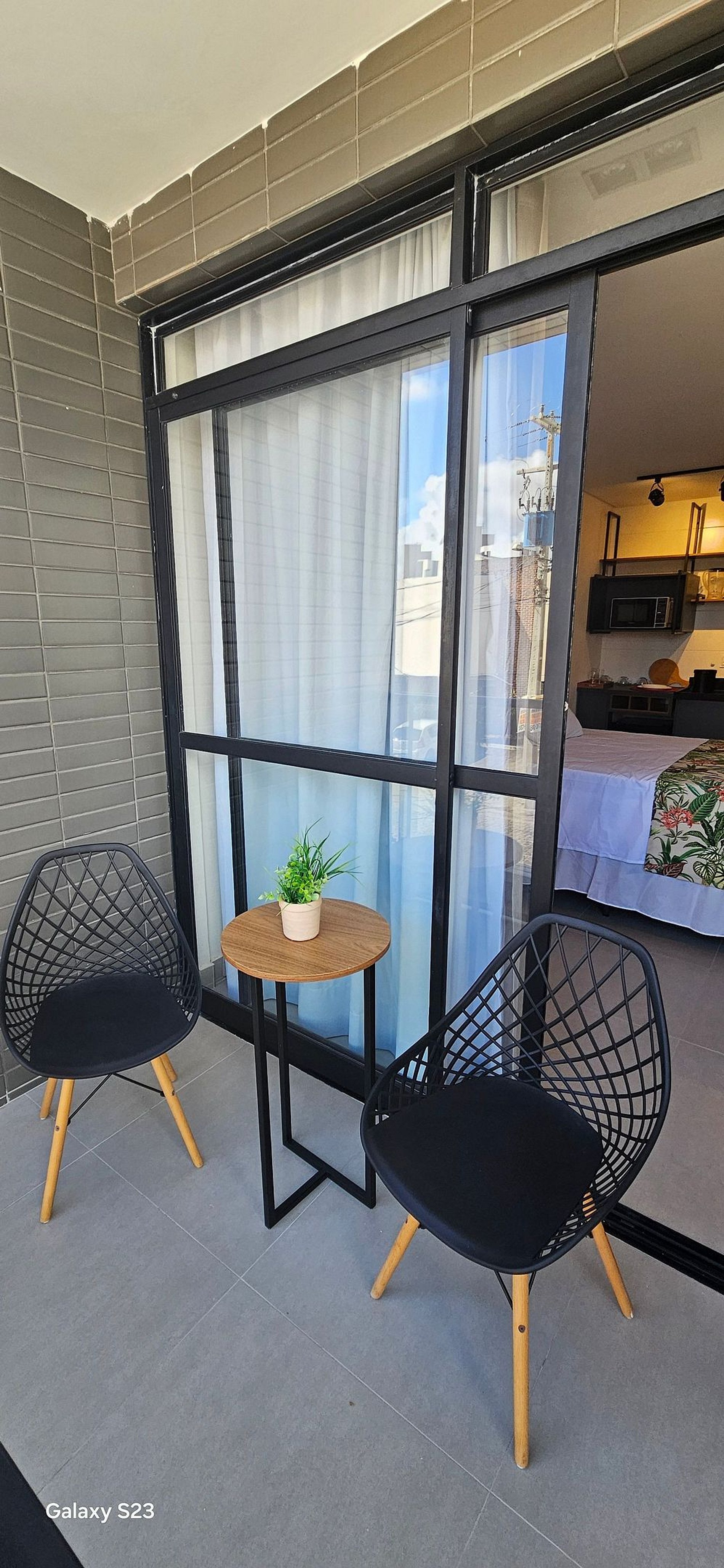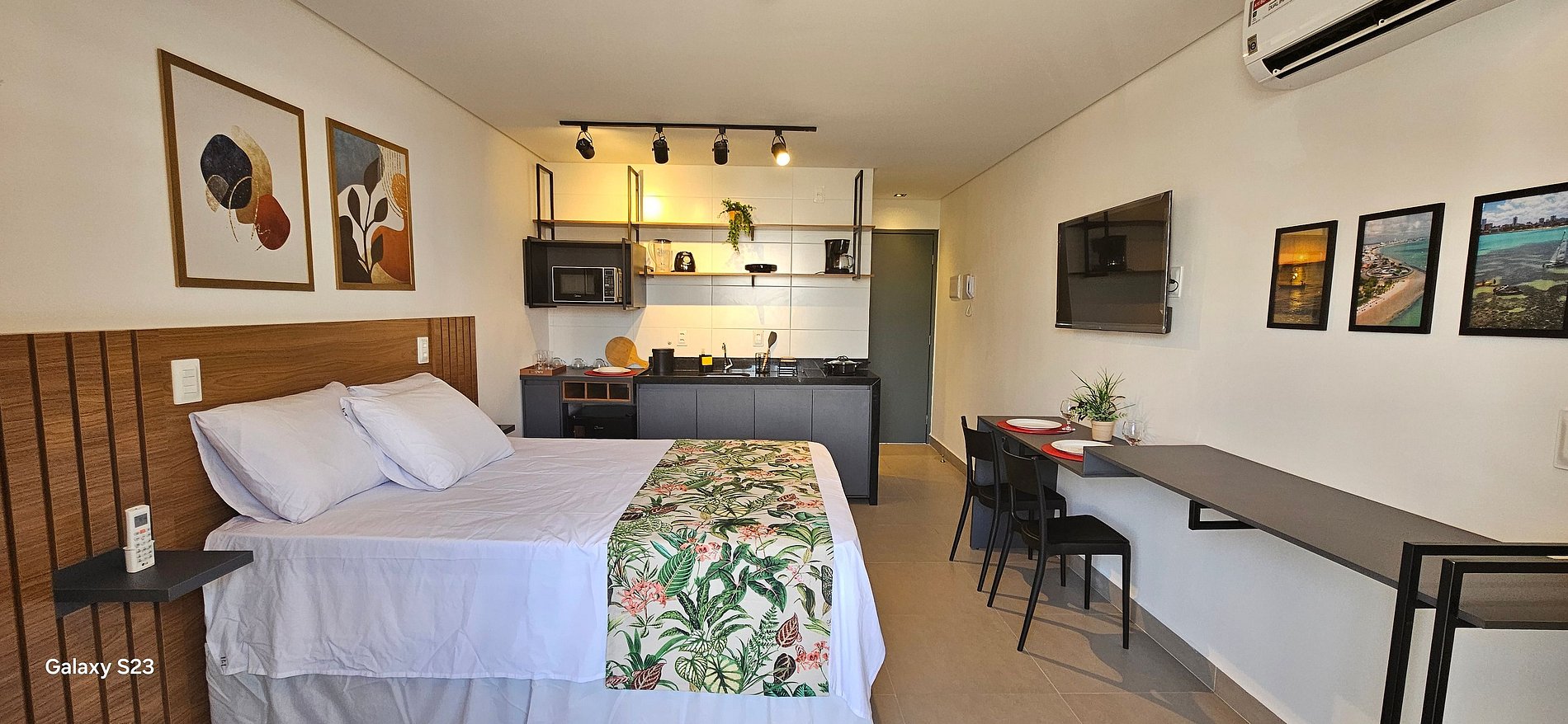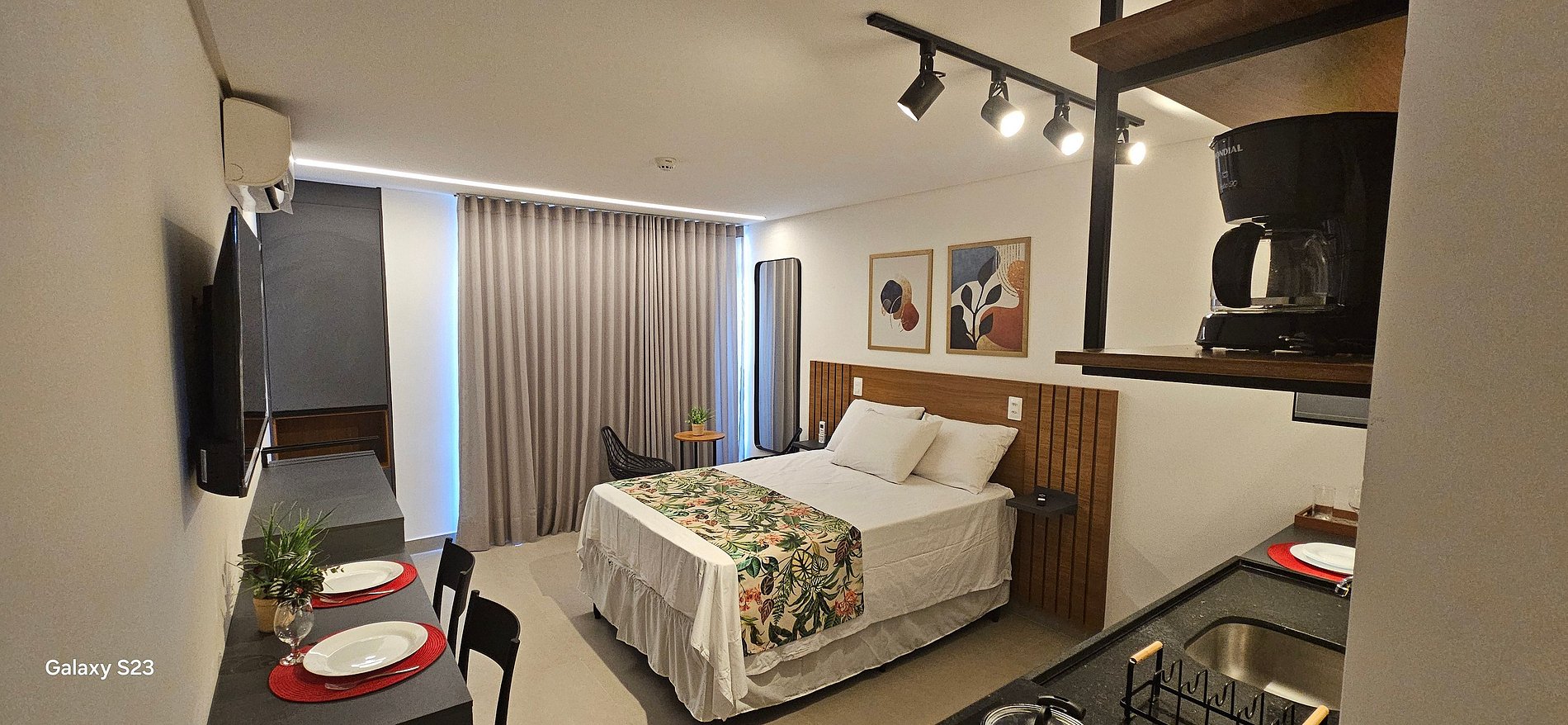 Perfeito para até 3 pessoas, o apartamento oferece ambiente moderno, varanda com vista para a cidade, ar-condicionado, Wi-Fi, TV, blackout e cozinha compacta equipada com micro-ondas, cafeteira, cooktop, liquidificador etc.