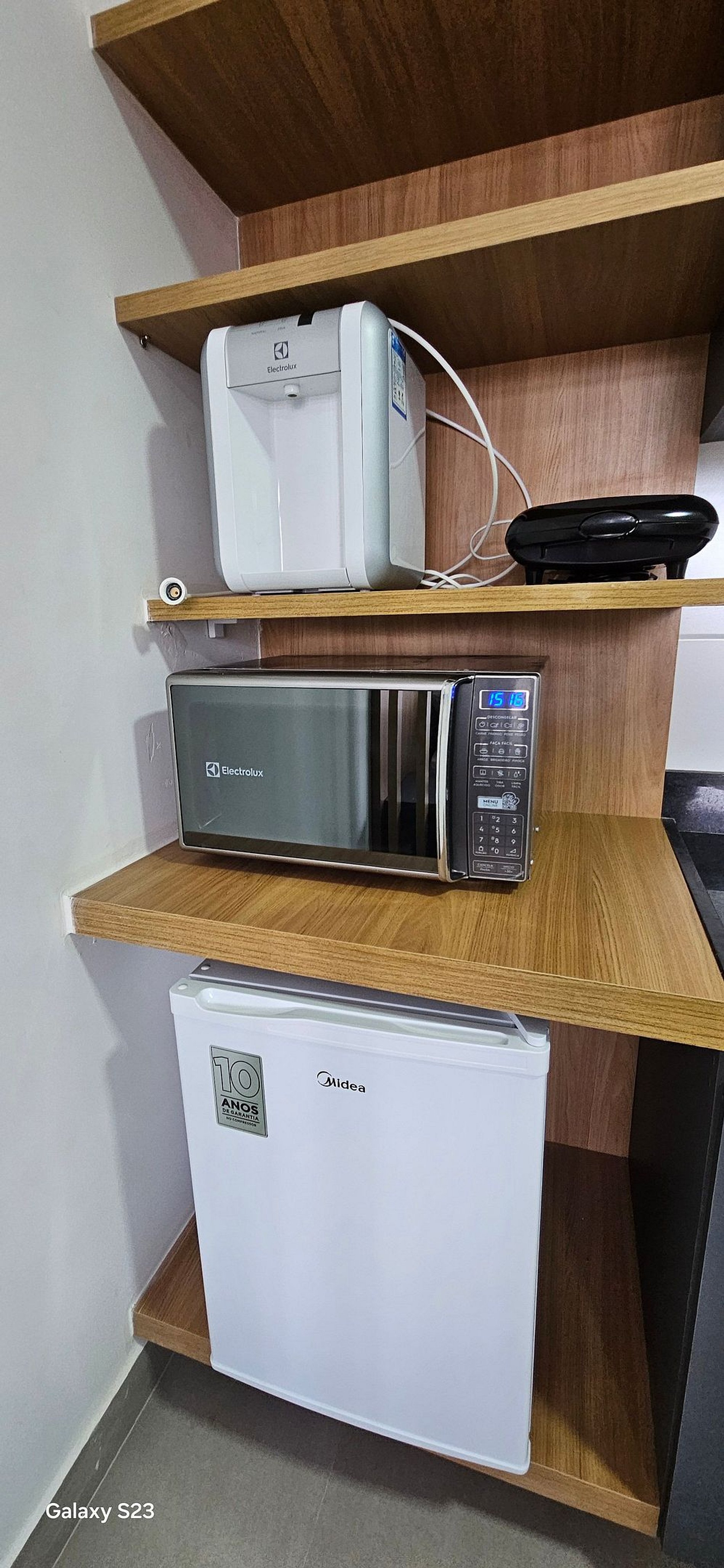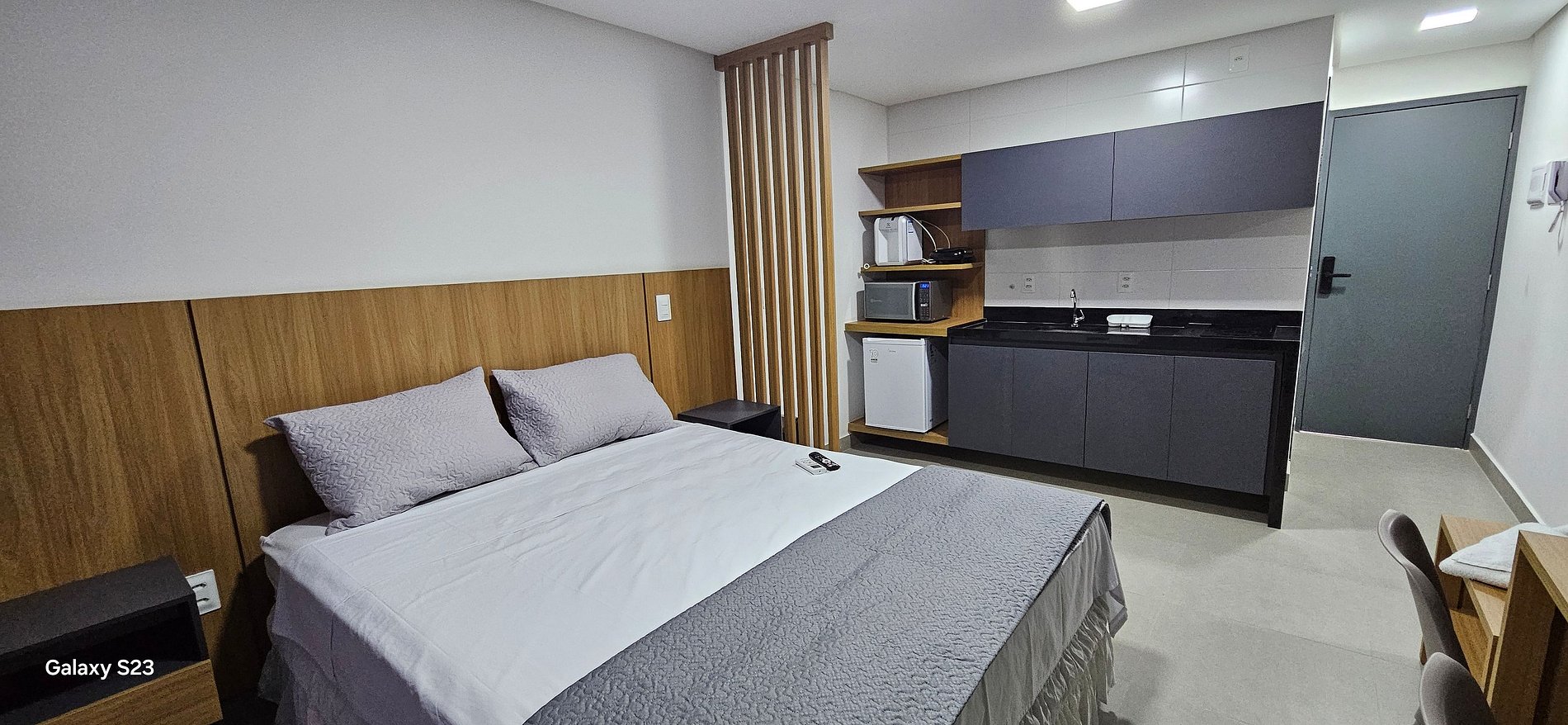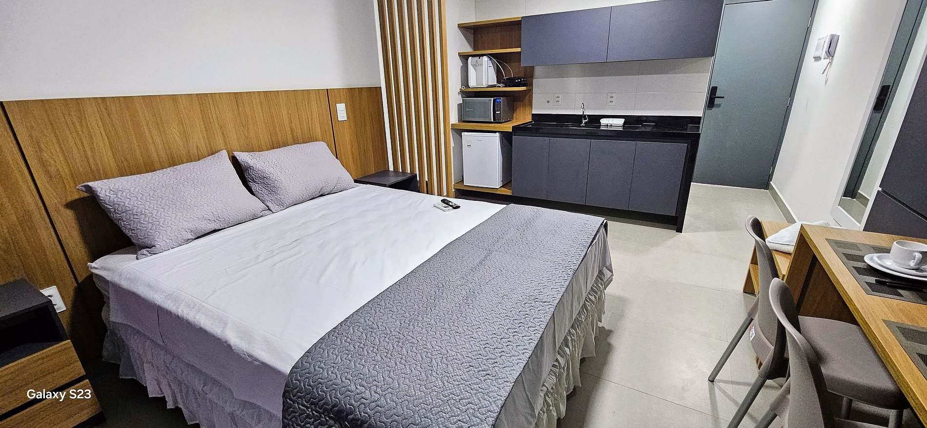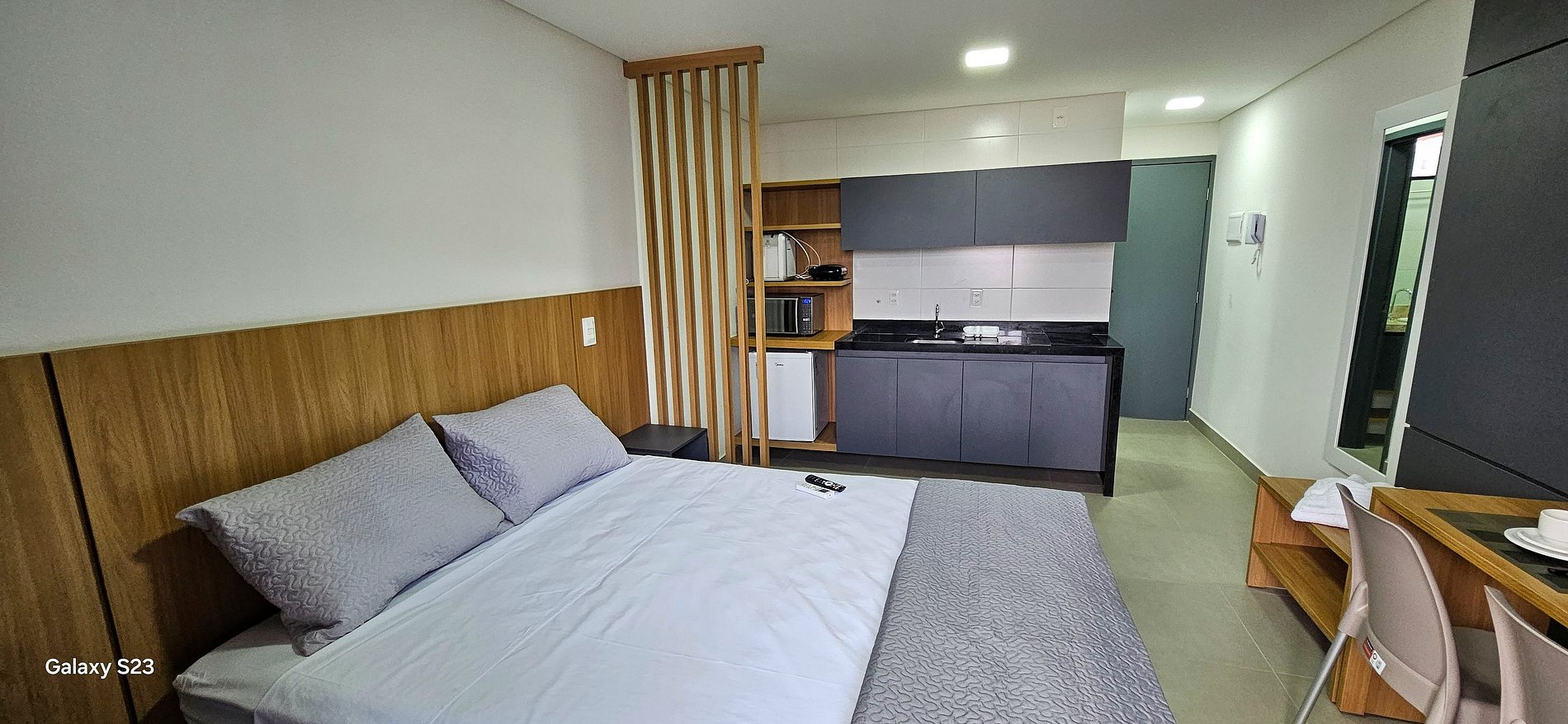 Nossas acomodações oferecem uma cozinha compacta, perfeita para o preparo de refeições rápidas, proporcionando maior praticidade para os hóspedes.