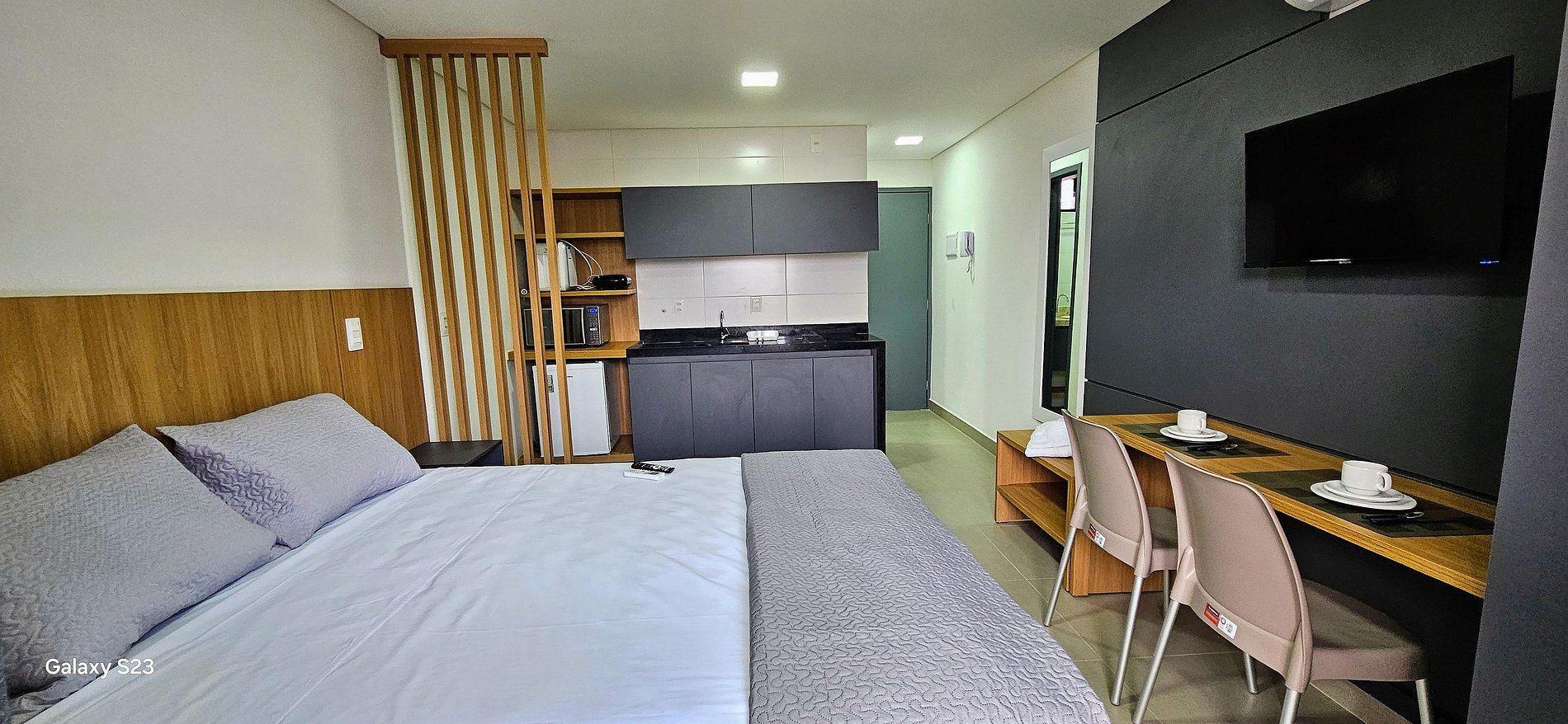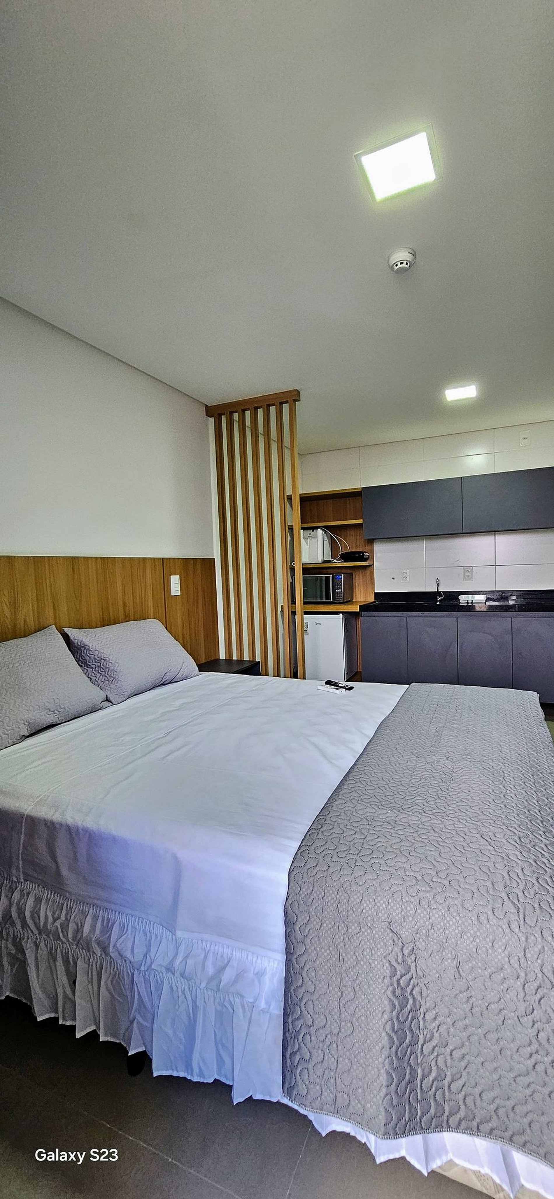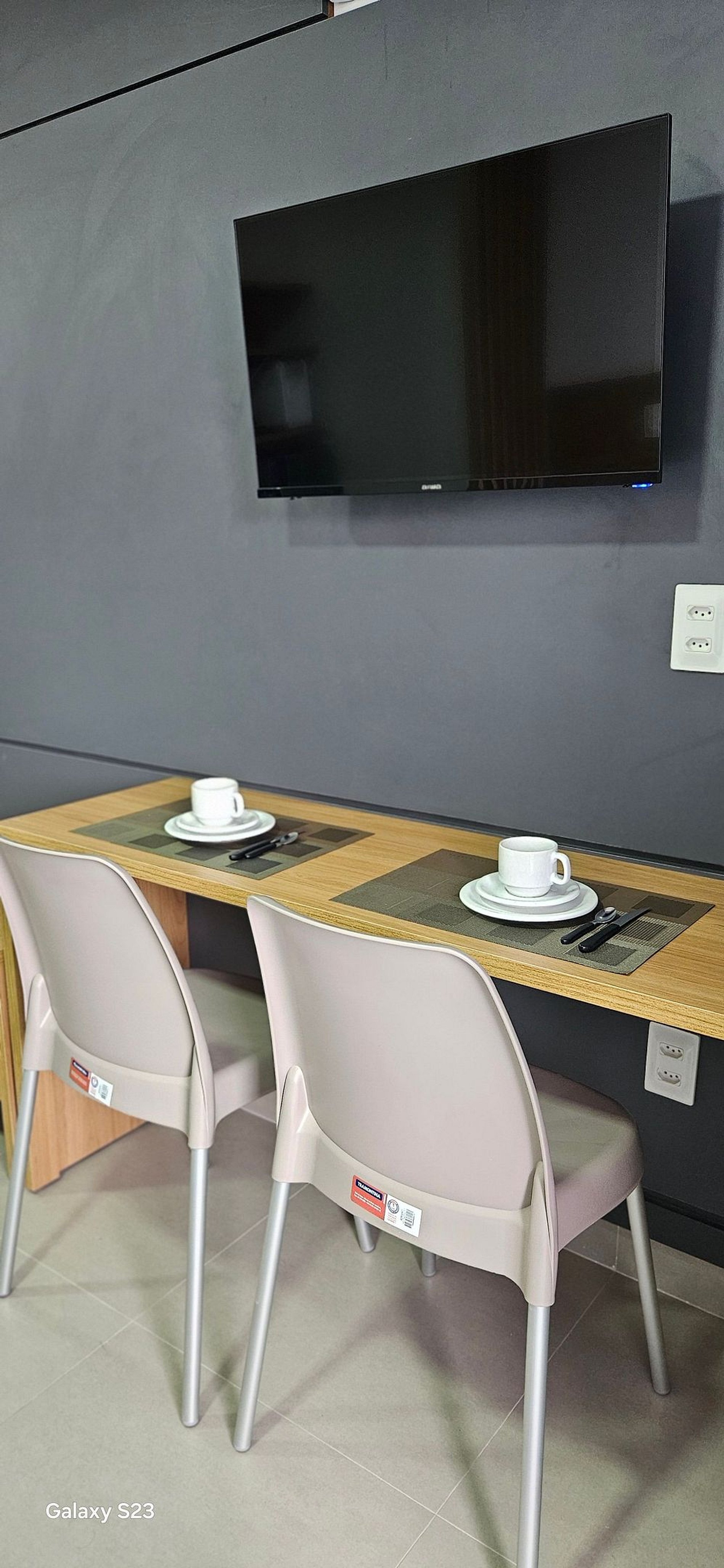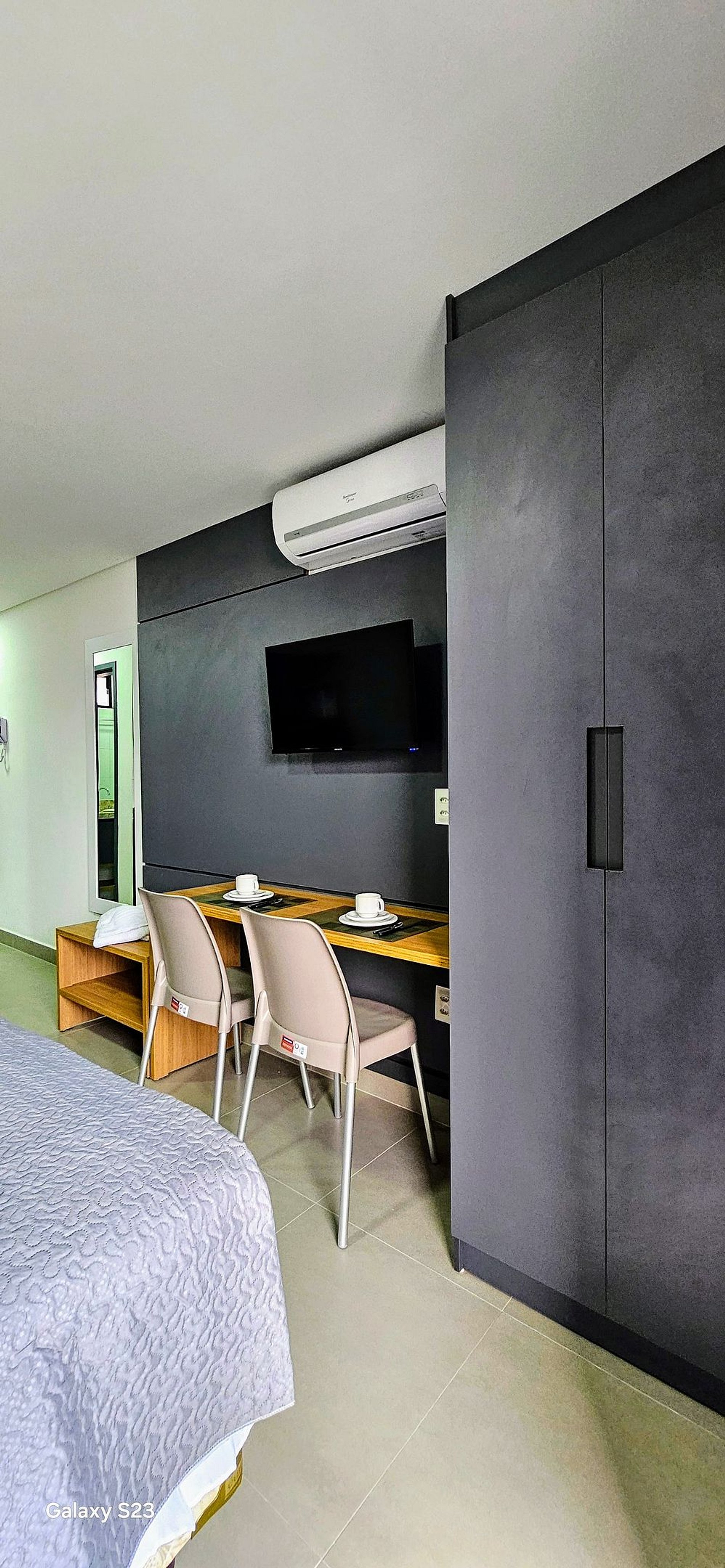 Nossas acomodações oferecem uma cozinha compacta, perfeita para o preparo de refeições rápidas, proporcionando maior praticidade para os hóspedes.