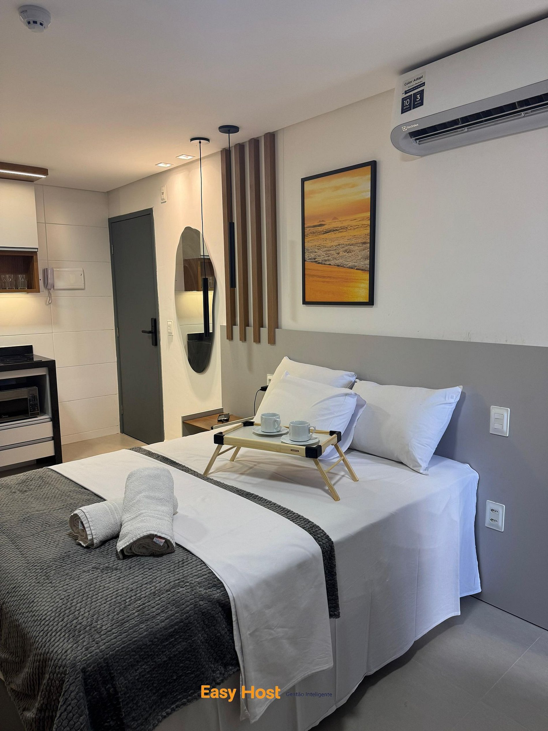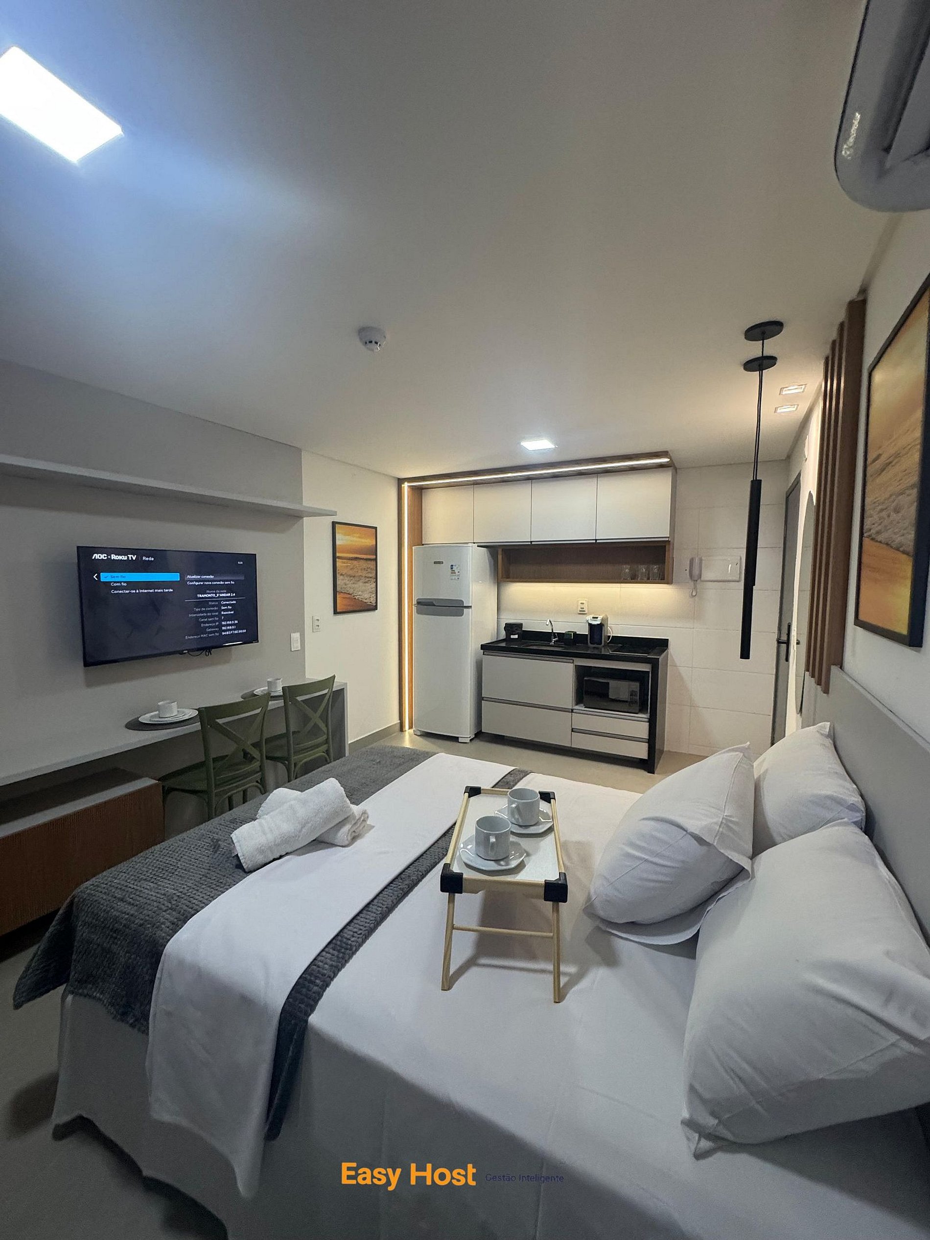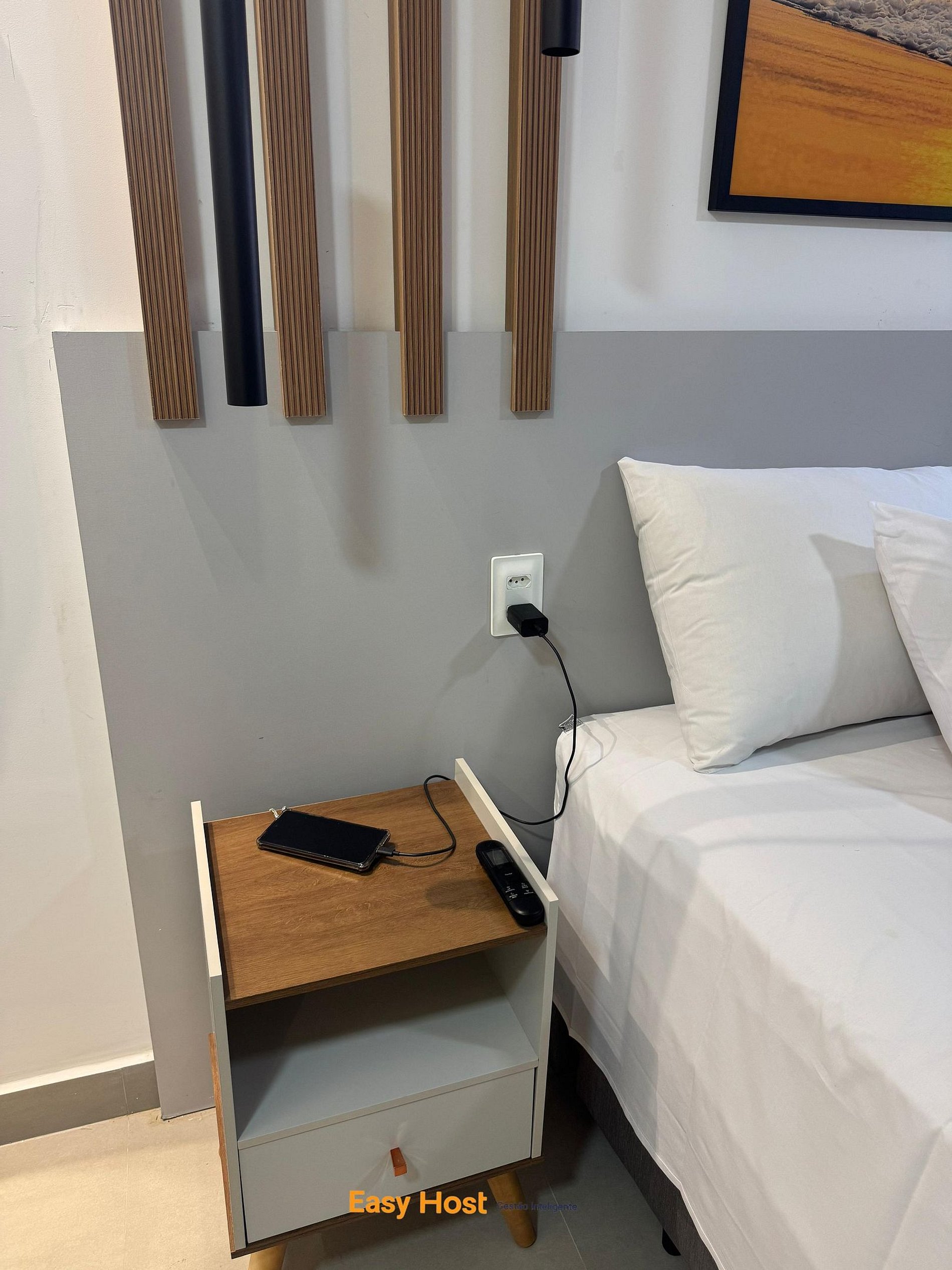 O flat também dispõe de enxoval básico completo, incluindo lençóis, fronhas, mantas, toalhas de banho, rosto e piso, tudo preparado com cuidado para garantir conforto e bem-estar.