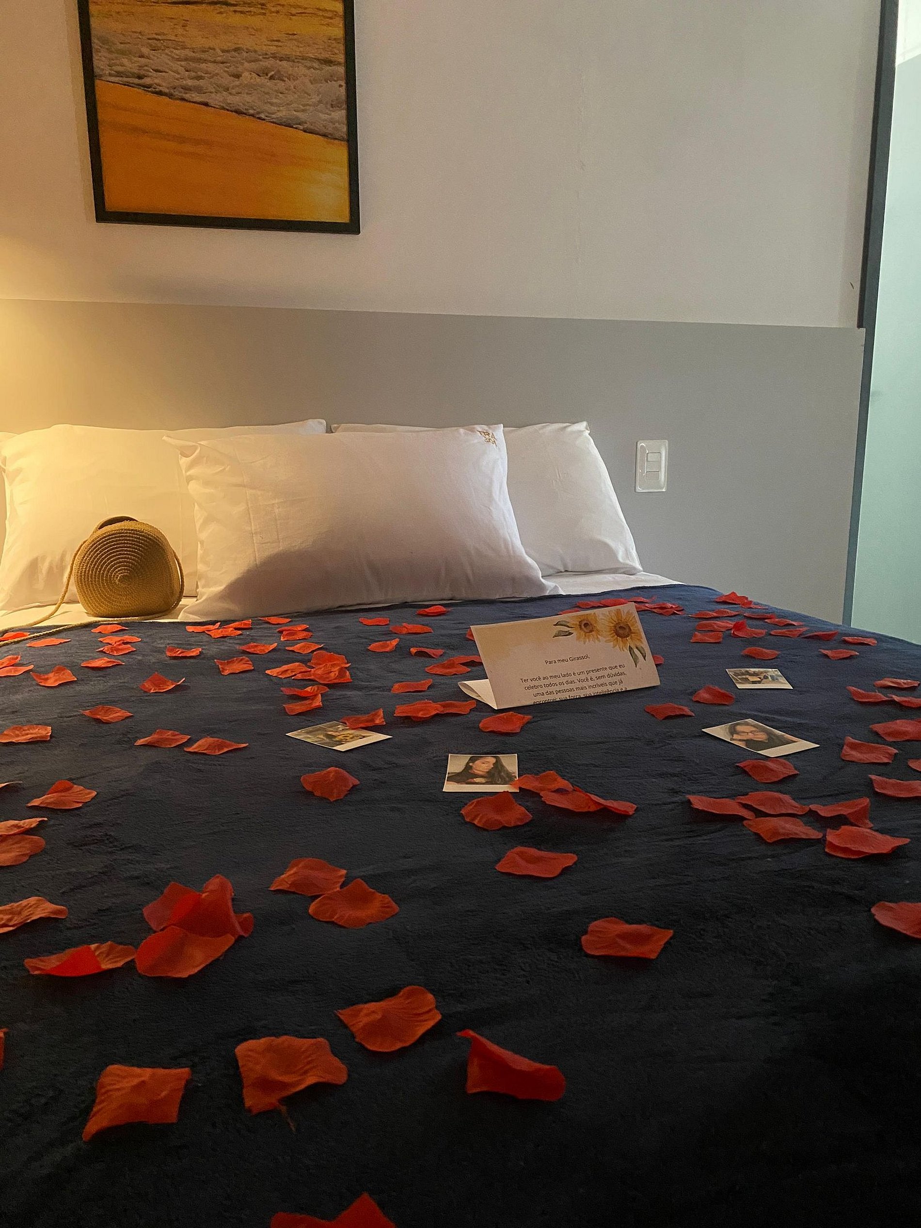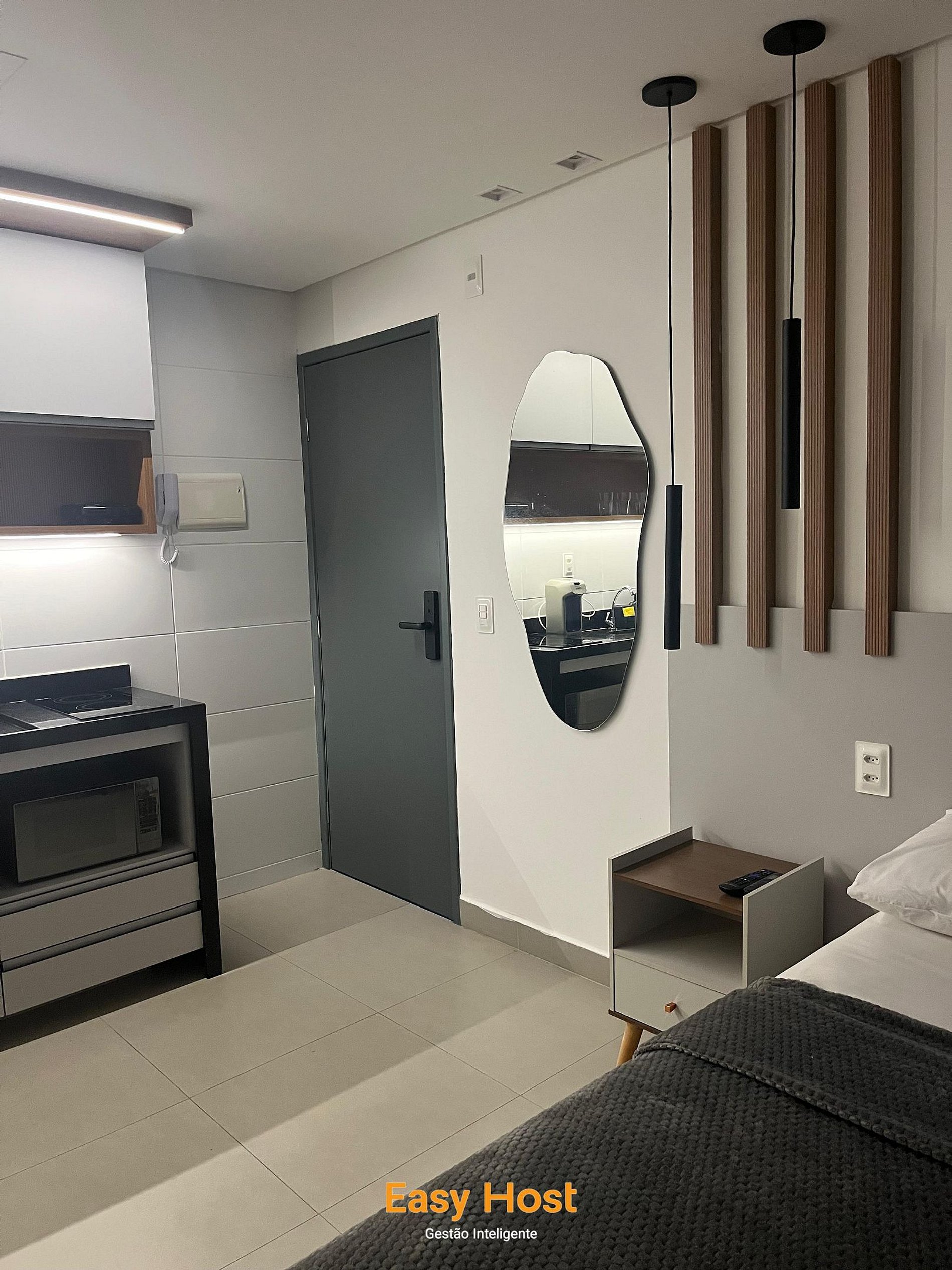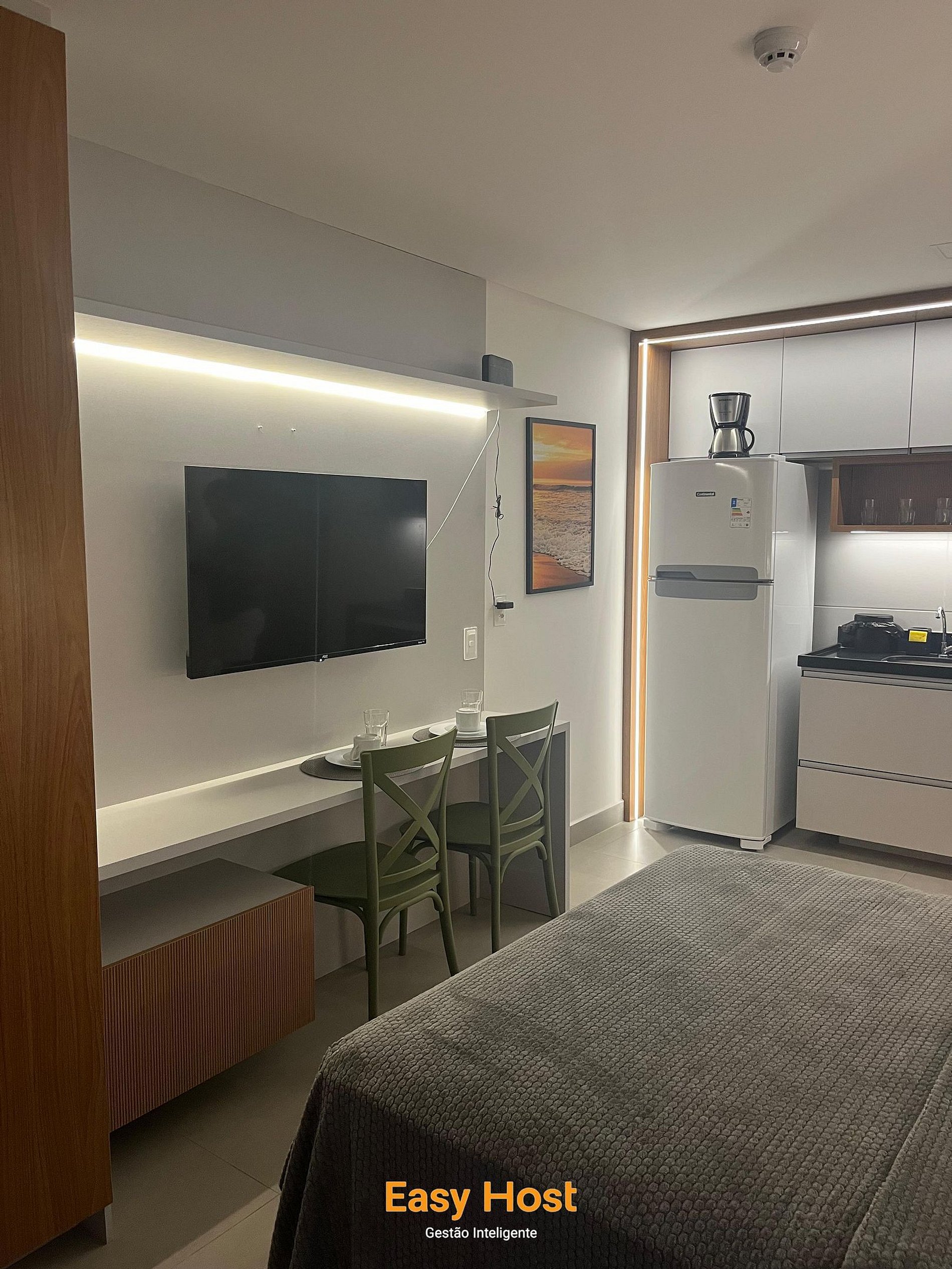 O flat também dispõe de enxoval básico completo, incluindo lençóis, fronhas, mantas, toalhas de banho, rosto e piso, tudo preparado com cuidado para garantir conforto e bem-estar.