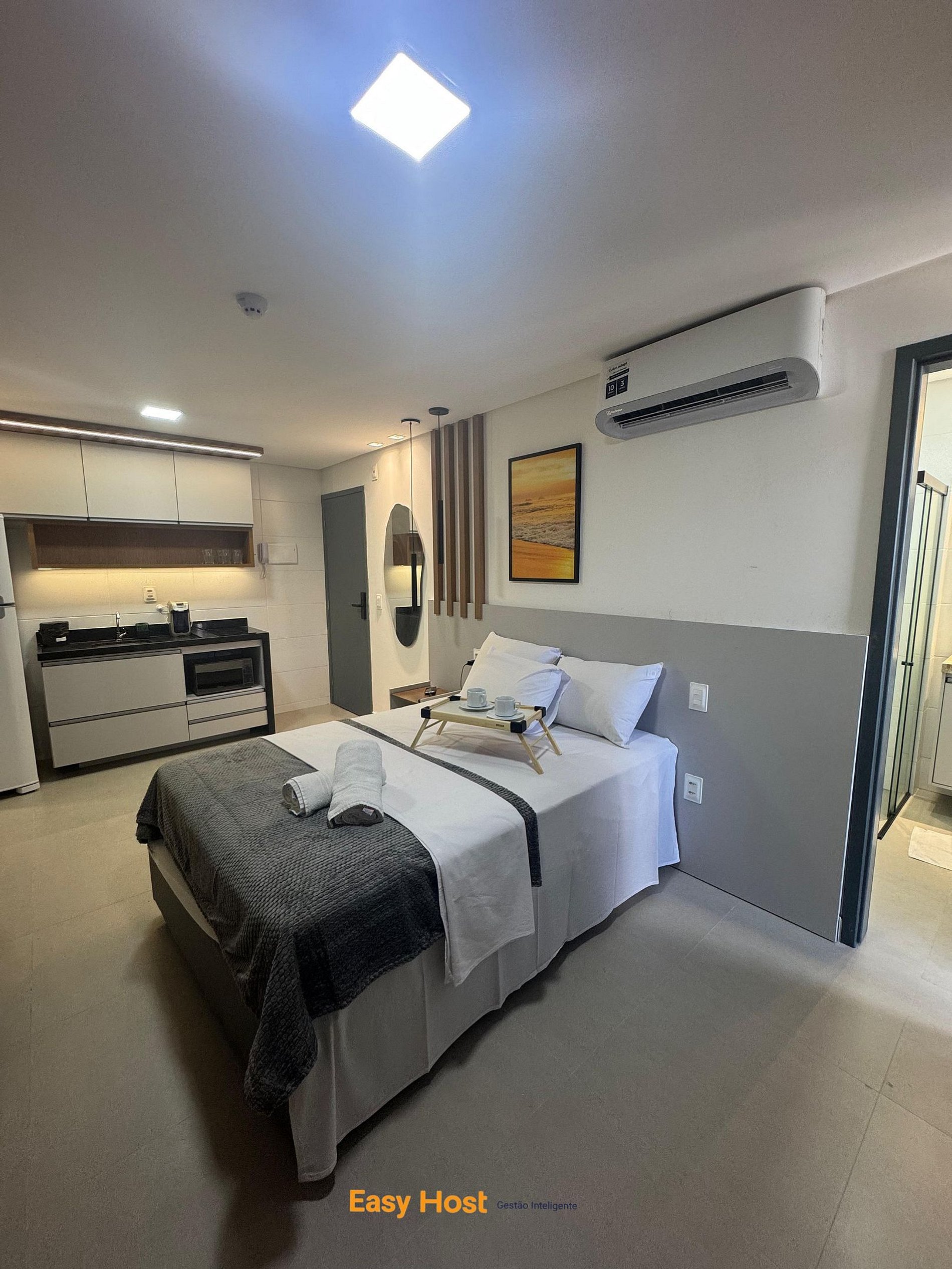 Aproveite João Pessoa em um apartamento moderno e acolhedor, ideal para até 3 pessoas. O espaço possui quarto confortável integrado à cozinha equipada, além de banheira de hidromassagem na varanda, perfeita para relaxar. Dispomos de enxoval básico completo e portaria 24h à disposição dos hóspedes. Localização excelente, próxima a praias, bares, restaurantes e vias principais da cidade.