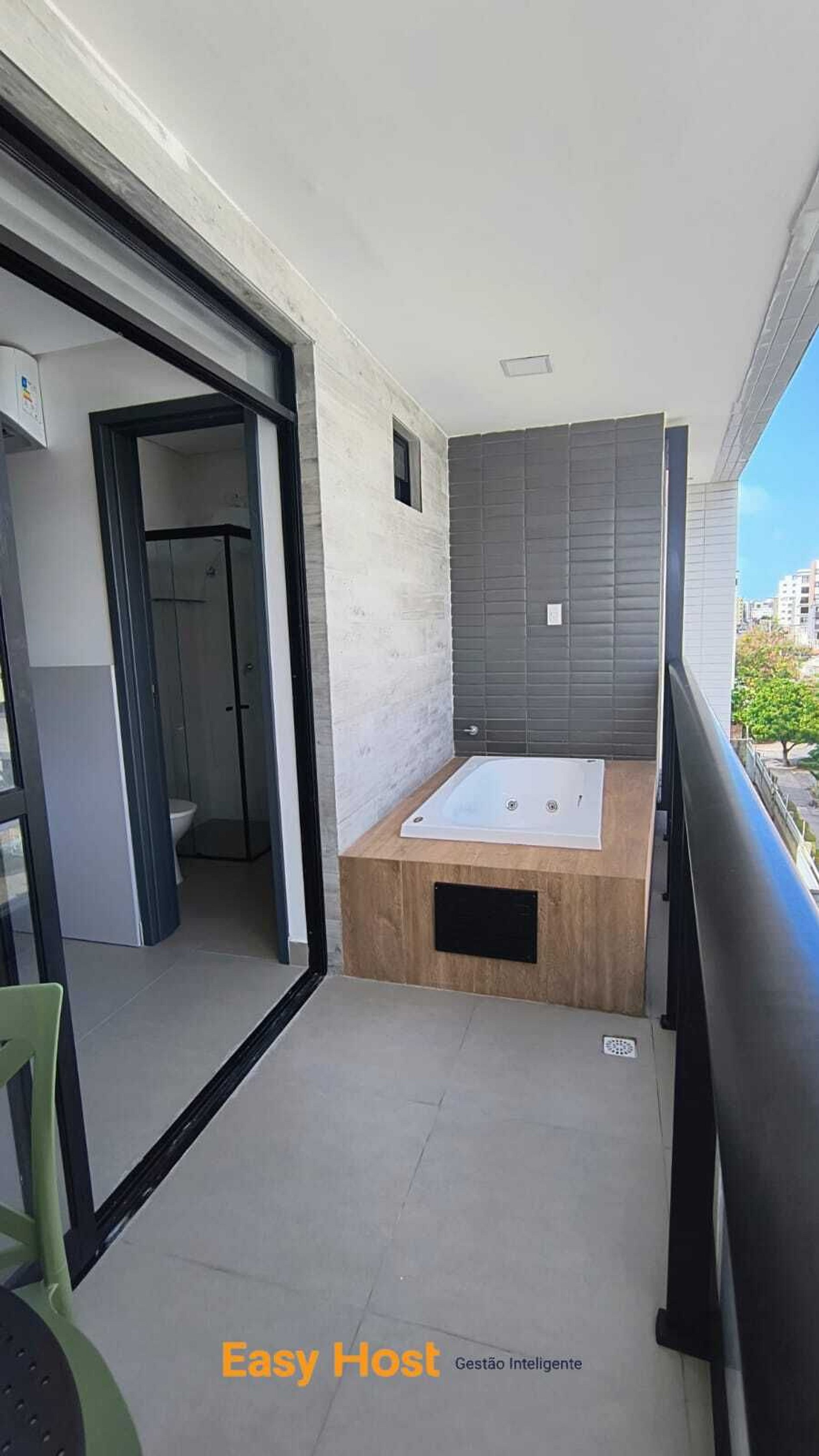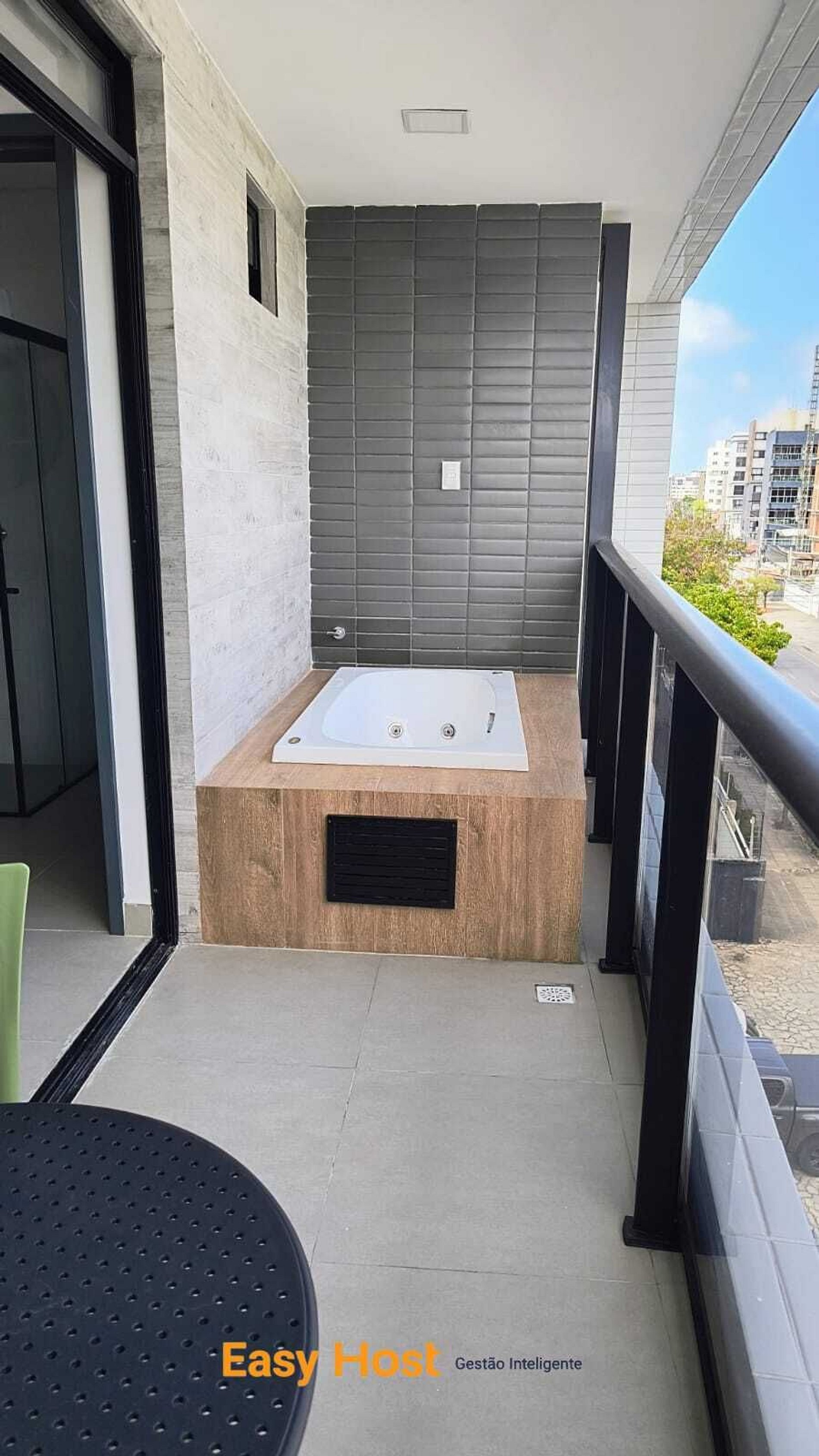 Na varanda, a banheira de hidromassagem em temperatura ambiente é o destaque do espaço — perfeita para relaxar após um dia de praia ou passeio pela cidade.