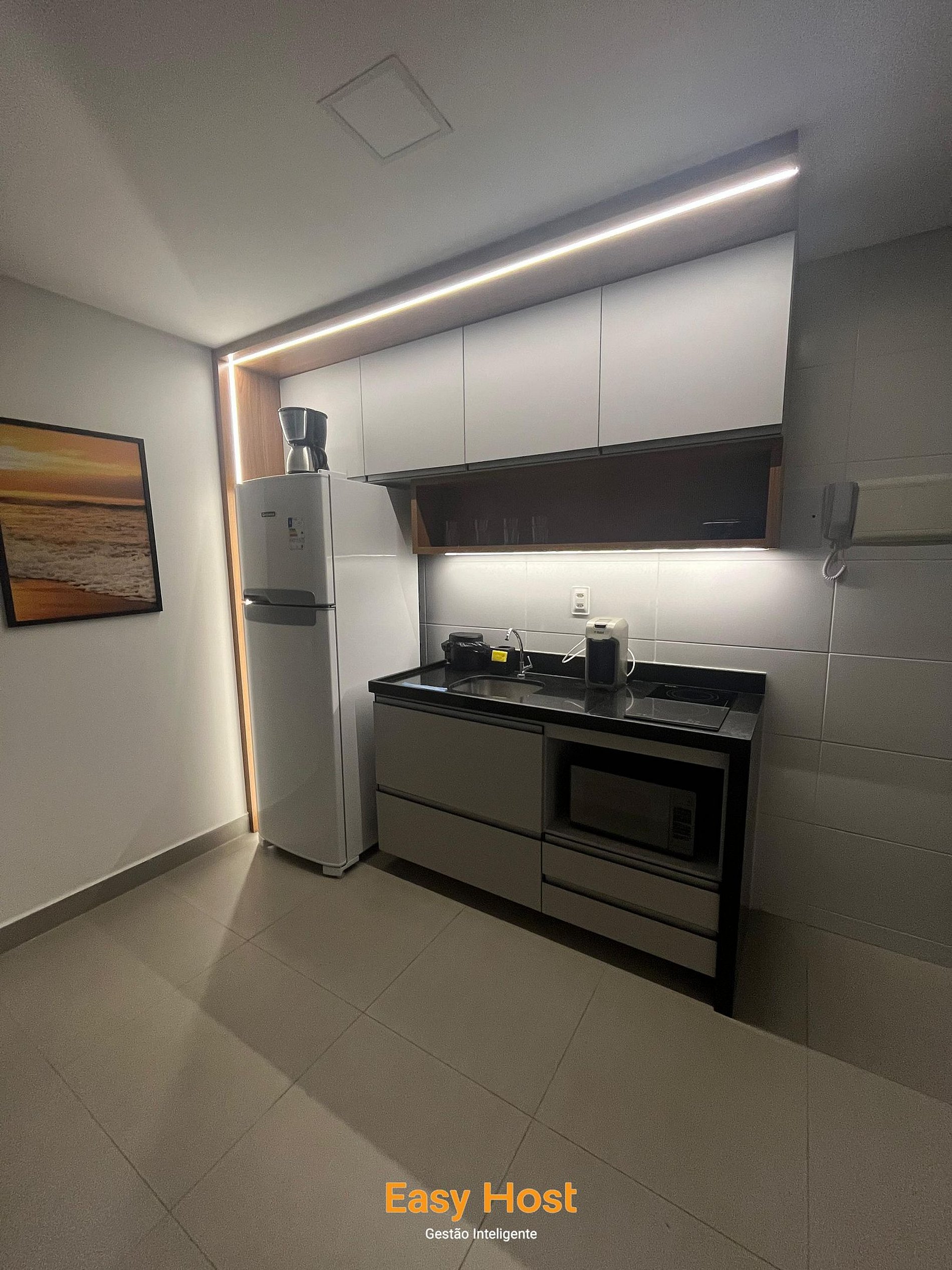 O apartamento acomoda até 3 pessoas, contando com um quarto aconchegante e integrado à cozinha equipada com fogão de indução, micro-ondas, cafeteira, liquidificador e utensílios apropriados. Essa integração proporciona um ambiente funcional e convidativo, ideal para preparar refeições rápidas e aproveitar momentos de descanso.