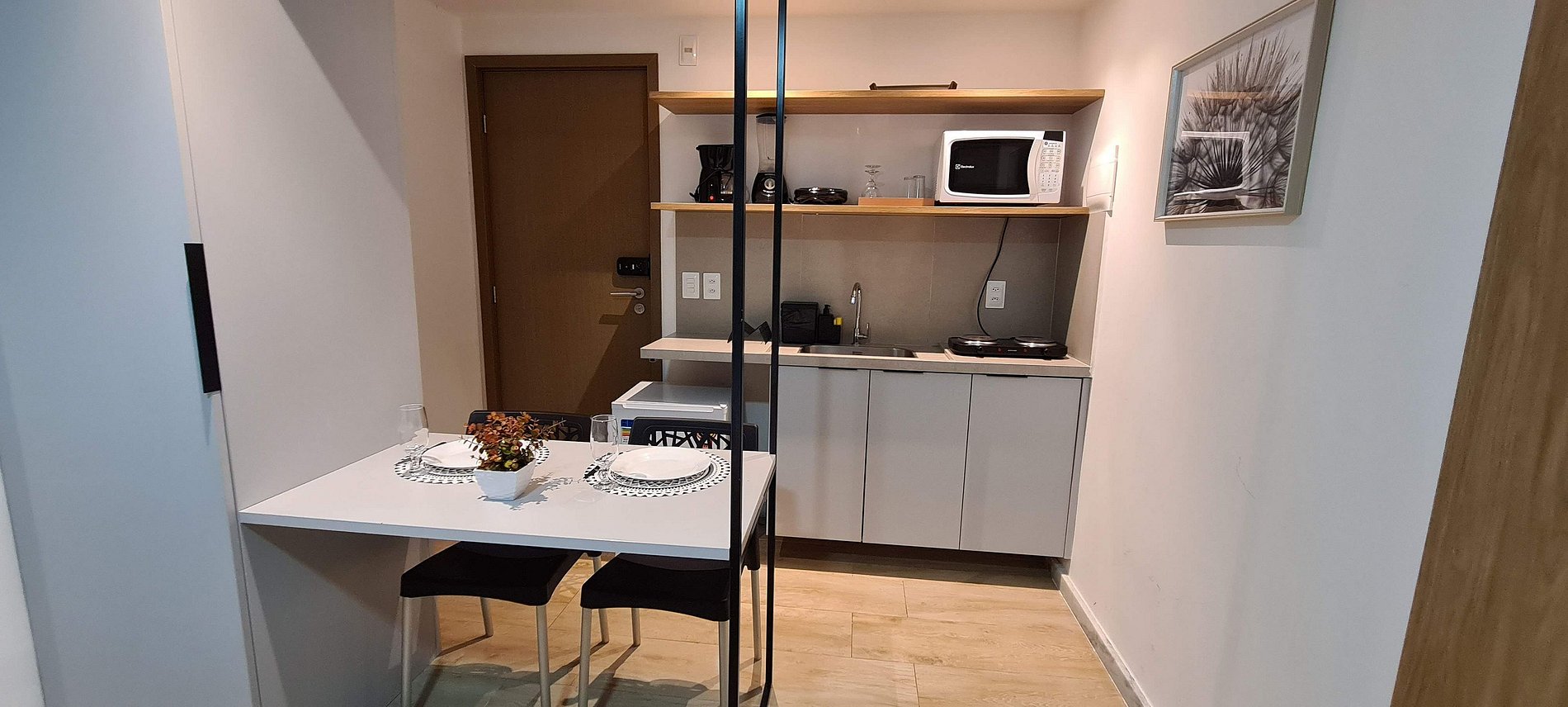 Nossas acomodações oferecem uma cozinha compacta, perfeita para o preparo de refeições rápidas, proporcionando maior praticidade para os hóspedes. Recebemos você com um enxoval básico no padrão de hotelaria, incluindo travesseiros, lençóis e toalhas, tudo preparado com carinho para o seu conforto. Vale ressaltar que não disponibilizamos edredons ou toalhas de praia, mas nossa equipe está sempre disponível para ajudar no que for necessário!